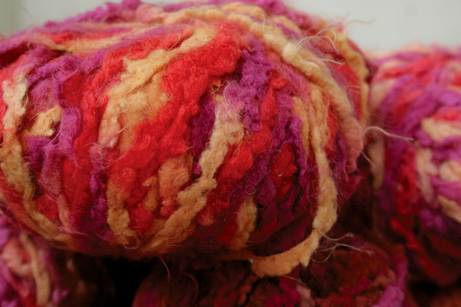 -синие - набранный из 3 тонких шерстяных ниток меланж, остатки от промышленных бобин, достались мне по случаю из благотворительного магазина по 50центов/штучка. я там скупила почти целую коробку, вернее - аж три, всяких бобин и клубочков, кто-то принес за ненадобностью, и уж больно "вкусные" на них поставили цены...