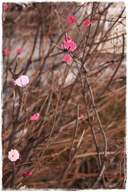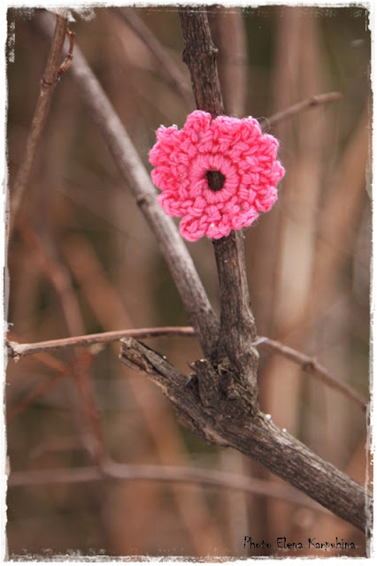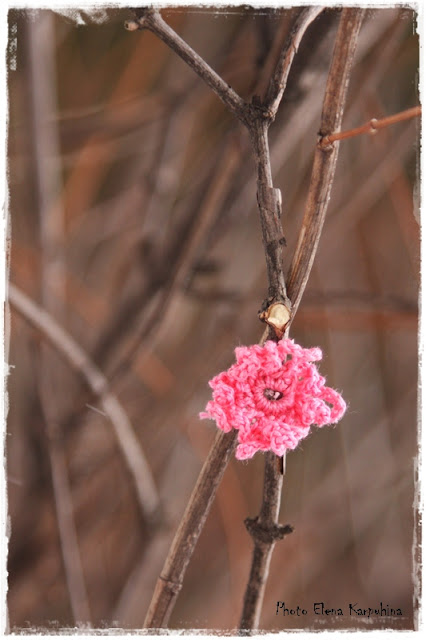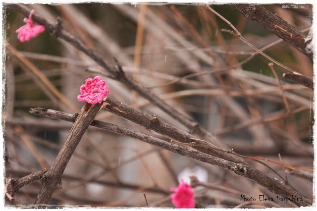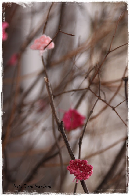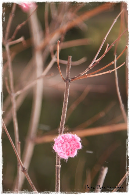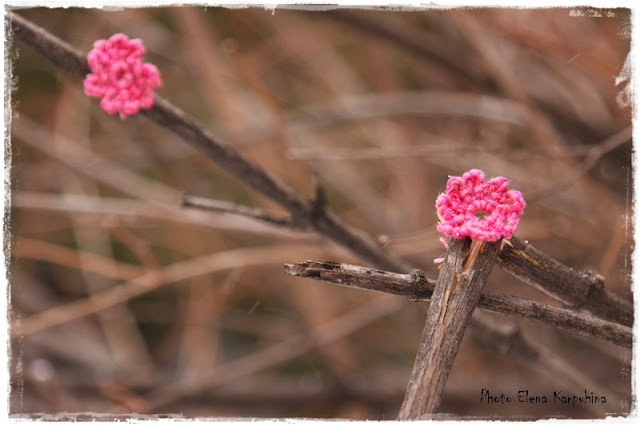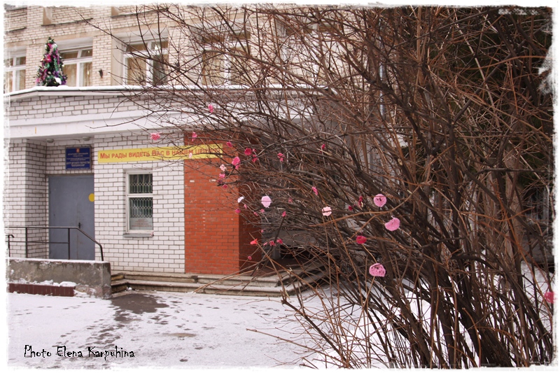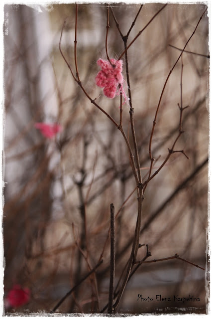 Загодя навязали розовых цветочков (получилось, к сожалению, не очень много) и украсили ими куст чубушника, растущий около входа в Центр творчества.
