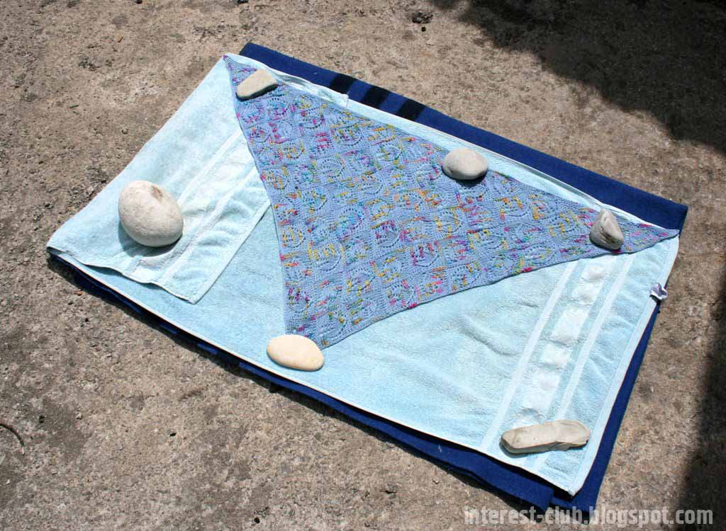 Приехали домой, я блокировала и высушила свою Дианну, попутно выяснив, что мотивы, из которых она состоит, тянутся без всяких предупреждений внаглую, как им в голову взбредет. И чтоб все листочки выглядели одинаково и нигде не были перекошены, это, блин, надо сильно постараться. А мне сильно не очень хотелось, если по чесноку. Надеюсь, Дианна на меня не в обиде. Зато я утвердилась в мысли, что такие шали надо вязать на одном дыхании, чтобы все мотивы были одинаковой плотности, иначе никакая блокировка не поможет.