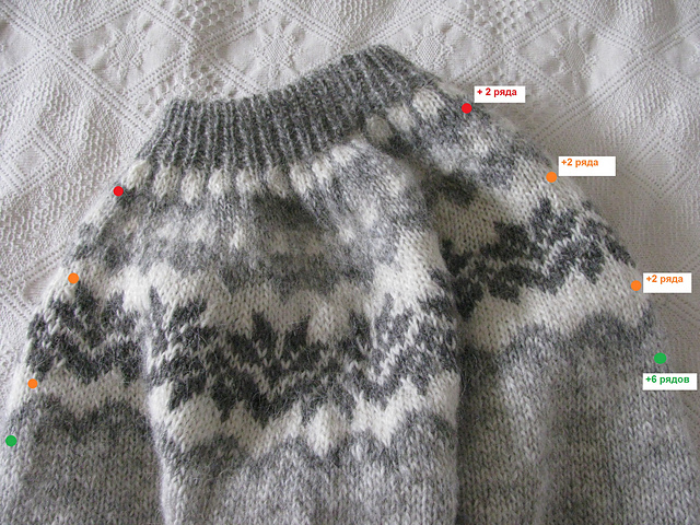 Небольшое приталивание по бокам, росток укороченными рядами начиная с низу кокетки. Т.к. мне не "улыбалось" вязать жаккард по изнанке, и узор на кокетке имел свободные от узора места, то там я и вписала дополнительные 12 рядов подъема для ростка (точками показаны места для сравнения переда и спинки):