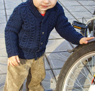 Жакет на худощавого годовалого мальчика. Пряжа - троицкая бобинная супервош, 32/2 в 6 сложений, спицы 2,5 мм., ушло около 250 гр. (не взвешивала) Швы только на рукавах (трикотажные подмышками я за швы не считаю). По-моему, получилось ми-ми-ми :)