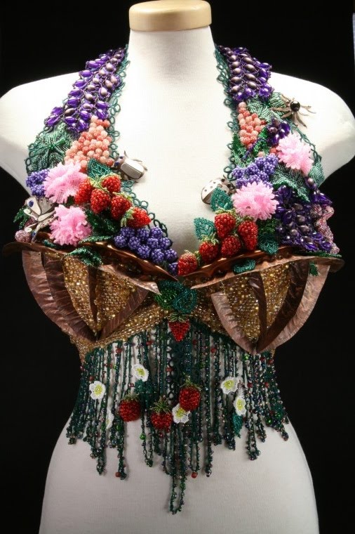И так, лифчик Света связала с бисером. Ниже будет мой первоначальный эскиз и вы можете заметить, что результат от эскиза отличается. Света связала не так, как я задумывала. Это был сюрприз, когда я его получила. И вообще, связано было совсем не так. Не отказывать же было Свете от участия. Теперь я могу написать, что то, что она прислала, повергло меня в панику. К счастью, в Ванкувере из всей нашей компании, я была не одна, а с Олей Махневой (еще одной участницей проекта). Оля меня успокоила, сказала, что где надо довяжем, подгоним под манекен и всё будет ОК. Пока Оля занималась мелкими исправлениями нашей важной основы, я придумала, что же мне делать с "вазой". Ведь вся идея держалась на том, что фрукты будут в металлических вазах (это была моя часть проекта). Закрывать самую красивую часть лифа было нерезонно!
