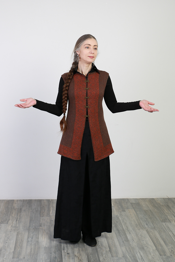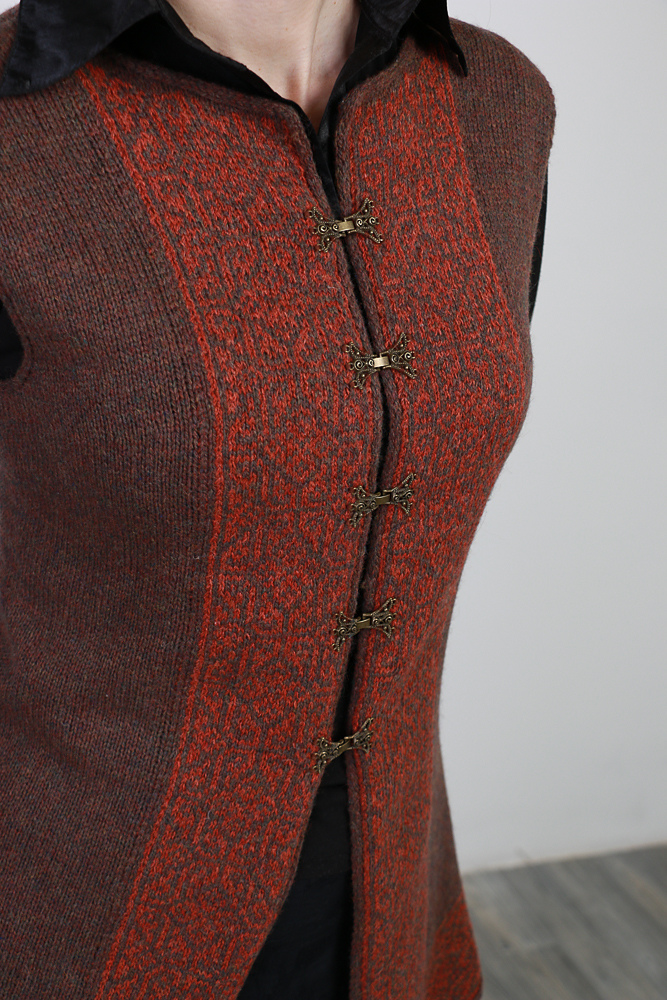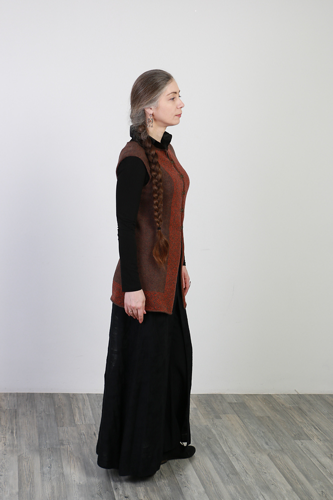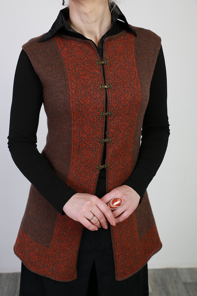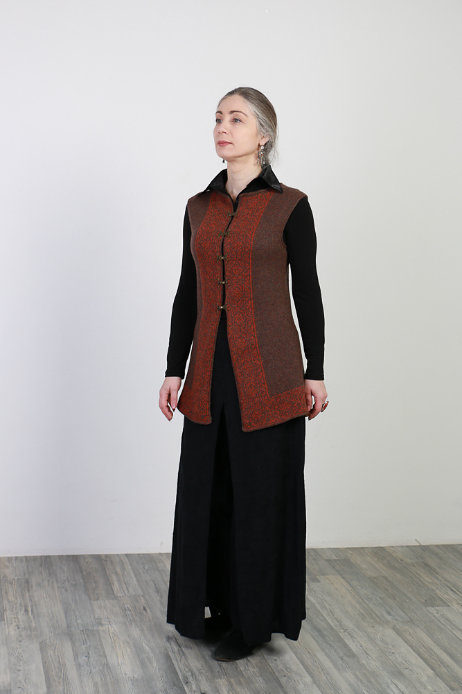 Жилет связан сверху вниз, обработка краев - дуршнур. Спереди я пришила застежки для браслетов латунные, которые неплохо справляются с несвойственной им функцией и отлично вписались по цвету и стилю. Добавлю также, что, помимо жилета, в представленном образе есть еще несколько ультрамодных в 70-е деталей. Это юбка-брюки и трикотажная блуза с атласным воротничком. К сожалению, форма воротничка не полностью соответствует стилю 70-х (сам он должен быть побольше, концы поострей)