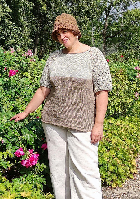 реглан сверху по кругу, с ажурными рукавами и ажурными вставками по бокам. нитки Garnstudio DROPS Bomull-Lin, спицы 4 мм. узор взят с просторов интернета, при расширении рукавов новые петли вводились в узор. небольшие подрезы имеются.