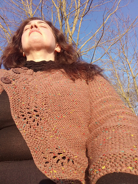 Рекордные сроки - начат 11 февраля, закончен 26, то есть чуть больше двух недель. Из них я неделю болела, из неё 4 дня лежала в постели и только вязала. Почти ничего не перевязывала. Но без пуговиц от у меня ждал ещё 3 дня :)
