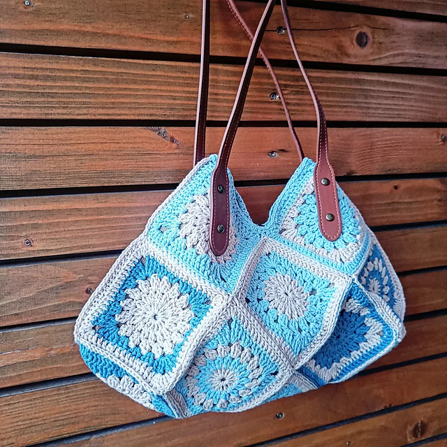 сумка Цирцея. остатки ниток Drops loves you 9, голубые ушли в ноль, бежевых тоже почти не осталось. хотелось добавить ещё цветов, но тёмно-синий не подошёл. квадраты я связала быстро.